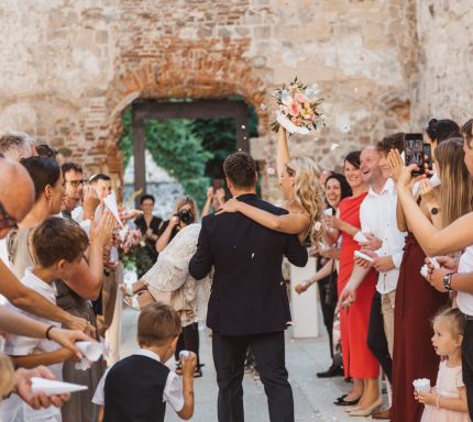 Po obredu se zgodba nadaljuje v najstarejši gostilni na Slovenskem – Gastužu, kjer danes domuje restavracija Spargus. V edinstvenem ambientu, ki združuje dediščino in sodobno eleganco, lahko pripravimo intimno slavje do 45 oseb ali večje pogostitve v elegantno urejenem šotoru. Naša kulinarika, ki jo ustvarja ekipa Spargusa, poskrbi, da bo vsak grižljaj poseben – od sprejema s penino do zadnjega nazdravljanja pod zvezdami.
